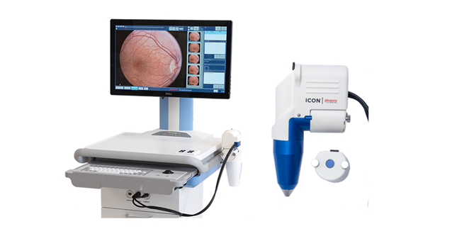鳳凰科技集團充分發(fā)揮現有的技術優(yōu)勢,于兩年后推出具有革命性的廣域視網膜成像攝像機—— Phoenix ICON平臺,為臨床醫(yī)師帶來福音。Phoenix ICON視網膜成像平臺是基于護理車的系統,采用手持式攝像機和鳳凰新專利成像技術,結合直接環(huán)形照明、光學和傳感器技術,具有令人驚嘆的高對比度、高品質、高分辨率影像。 攝像機的機頭部位配有交替閃爍式LED燈源(白色和藍色光),可用于明視場與熒光素血管造影成像,便于用戶切換成像方式。光的強度和增益均可控制,因此,在保證患者舒適度的前提下,用戶可根據不同的區(qū)域和結構需求靈活調整光照級別以優(yōu)化成像品質。值得一提的是,深度著色性視網膜非常得益于直接照明、優(yōu)化光學元件以及成像軟件。最后,產品腳踏板設計非常便捷,觸摸屏界面也便于采集護理車上計算機所存儲的視頻或靜態(tài)圖像,這些特性均有助于簡化整個影像的采集流程。