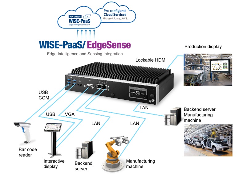 在裝配設(shè)施的每個工作站,配有合適電源、LAN 和 HDMI 接口的研華 ARK-2250 均被安裝于機(jī)械手臂并連接支持可鎖線纜設(shè)計(jì)的電源、網(wǎng)絡(luò)、監(jiān)控傳感器,從而防止任何線纜或電纜脫落而導(dǎo)致生產(chǎn)故障或中斷。為啟用數(shù)據(jù)采集、數(shù)據(jù)顯示和遠(yuǎn)程監(jiān)控功能,ARK-2250 及后端服務(wù)器都已部署研華 IoT WISE-PaaS/RMM 軟件平臺。