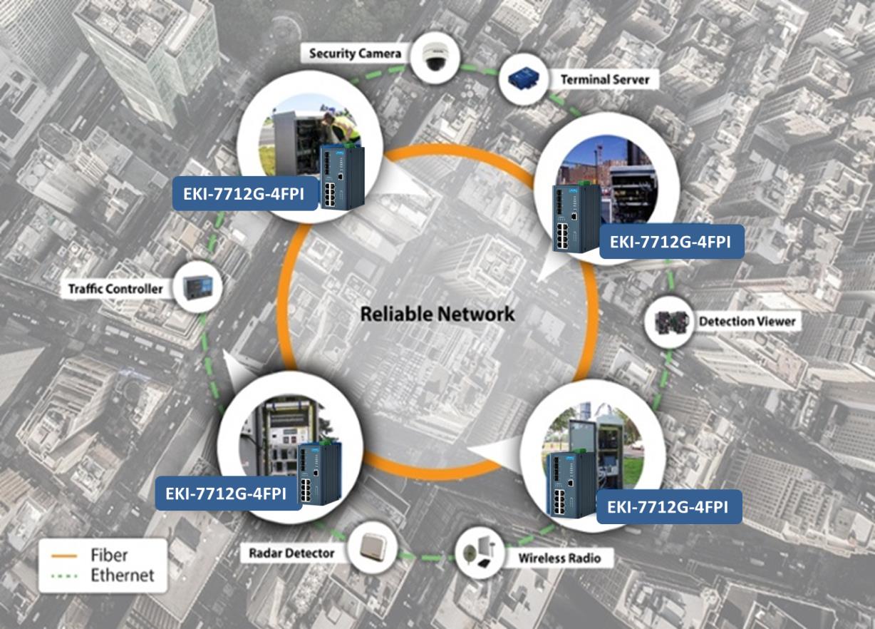EKI-7712G-4FPI支持具有240 W PSE功能的完整PoE +,非常適合為交通攝像頭和無線電供電和連接。