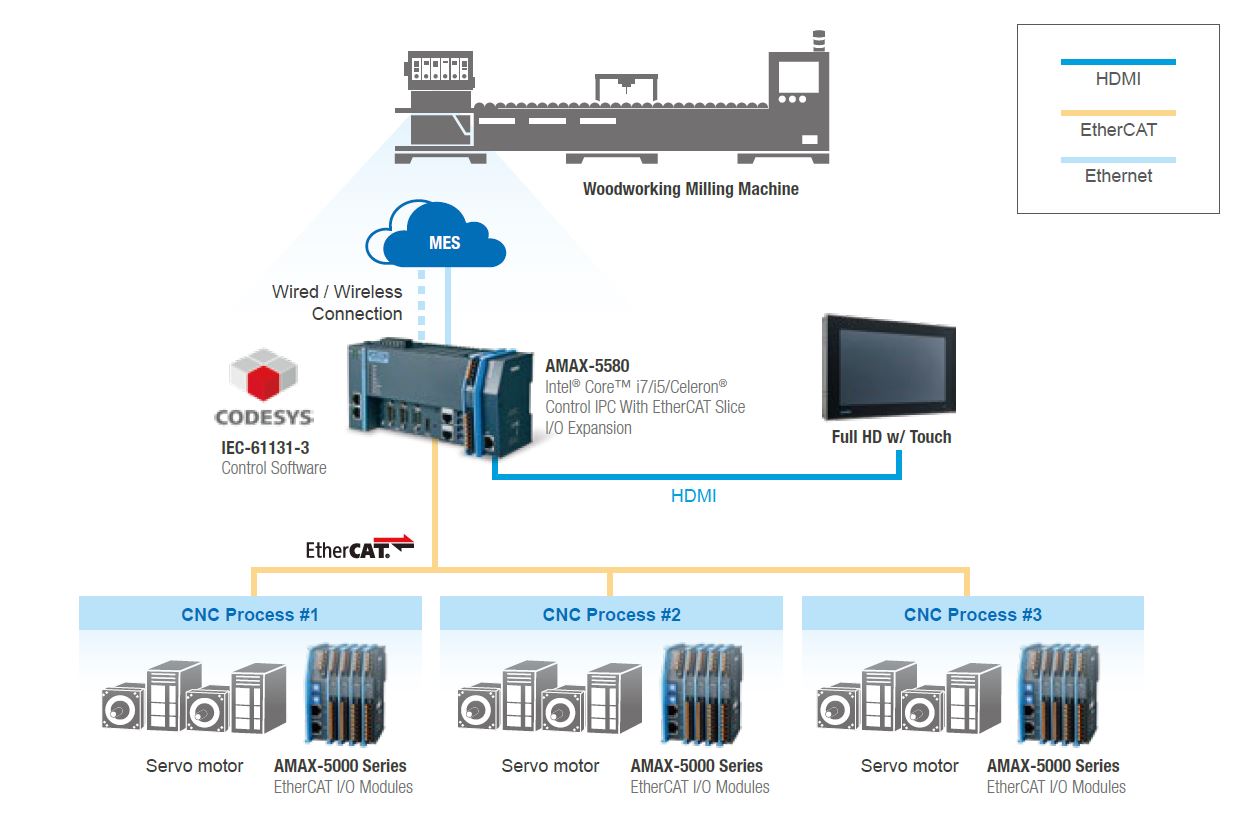 ▌▌客戶的需求提高加工速度和控制成本:加工速度是設(shè)備的核心指標(biāo)。由于原始控制器是傳統(tǒng)的CNC系統(tǒng),因此軸和程序的數(shù)量相對(duì)固定。為了滿足新的效率要求,客戶必須購(gòu)買三套CNC系統(tǒng)。隨著成本的增加,CNC系統(tǒng)之間的通信和調(diào)試成本也隨之增加。易于連接其他設(shè)備:現(xiàn)在連接了原來(lái)是獨(dú)立機(jī)械的木工設(shè)備。這臺(tái)CNC木銑床需要一個(gè)接口才能連接到上游雙頭鋸的PLC控制器。由于接口不足,傳統(tǒng)的CNC系統(tǒng)無(wú)法連接到上游PLC。高代碼兼容性:原始CNC系統(tǒng)的G代碼/ M代碼格式很嚴(yán)格。如果新軟件引入了新定義的M代碼,則需要制造商的R&D支持,這很困難并且需要很長(zhǎng)時(shí)間。連接數(shù)據(jù)庫(kù)和MES以實(shí)現(xiàn)信息化:平板家具的調(diào)度和靈活處理要求將客戶的設(shè)備連接到數(shù)據(jù)庫(kù)和MES。原始的系統(tǒng)信息界面很難擴(kuò)展和集成IT和OT。 ▌▌解決方案為了滿足上述客戶需求,研華與客戶共同開發(fā)了WISE-5580多工位木工CNC解決方案,將處理速度從2分鐘提高到20秒,實(shí)現(xiàn)了多工位擴(kuò)展并連接了MES。 研華的邊緣控制解決方案,高性能Intel處理核心,采用子核和子系統(tǒng)結(jié)構(gòu),集Windows7開放式信息環(huán)境和CODESYS實(shí)時(shí)自動(dòng)化內(nèi)核于一體,實(shí)現(xiàn)多軸運(yùn)動(dòng)控制、數(shù)控加工、數(shù)據(jù)庫(kù)和人機(jī)界面功能。嵌入式數(shù)控功能允許客戶靈活定義M代碼,支持EtherCAT總線,打破了傳統(tǒng)控制器軸控制的瓶頸,并與世林電氣的SDP EtherCAT系列伺服電機(jī)驅(qū)動(dòng)器配合,輕松實(shí)現(xiàn)多站同時(shí)處理,大大提高了設(shè)備加工率。模塊化接口擴(kuò)展允許設(shè)備連接上下游設(shè)備。研華的CODESYS數(shù)據(jù)庫(kù)模塊允許設(shè)備快速連接到MES以實(shí)現(xiàn)在線調(diào)度。
