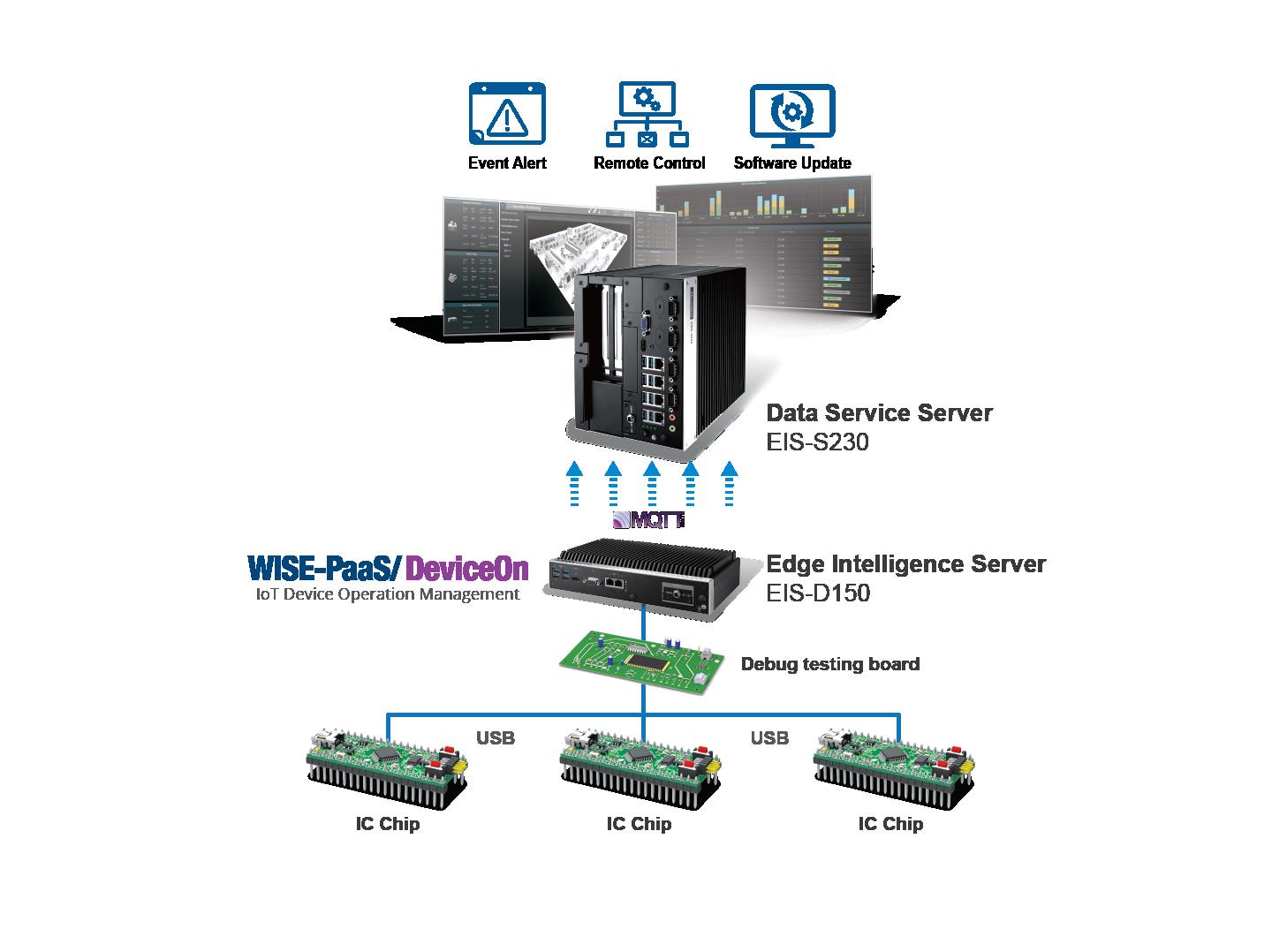 本案客戶在測試生產線上共構建了數百臺邊緣智能服務器EIS-D150,各自連接到不同芯片測試設備,數據上傳中控室數據管理服務器EIS-S230進行集中式管理監(jiān)督,EIS-S230基于容器與微服務構架,具有資源水平擴增與動態(tài)平衡等功能,提供高擴充性與高穩(wěn)定性的平臺服務。WISE-PaaS/DeviceOn平臺整合了所有物聯網和云端應用所需要的開發(fā)工具與文件,包括提供儀表板建置器予客戶建立客制化的儀表板,進行數據可視化呈現,并方便用戶透過直覺式界面進行裝置管理;此外,客戶可利用Node-RED數據流程邏輯設計工具有效的改善開發(fā)測試流程,并透過OTA功能進行遠端軟件更新、快速布署測試程序。