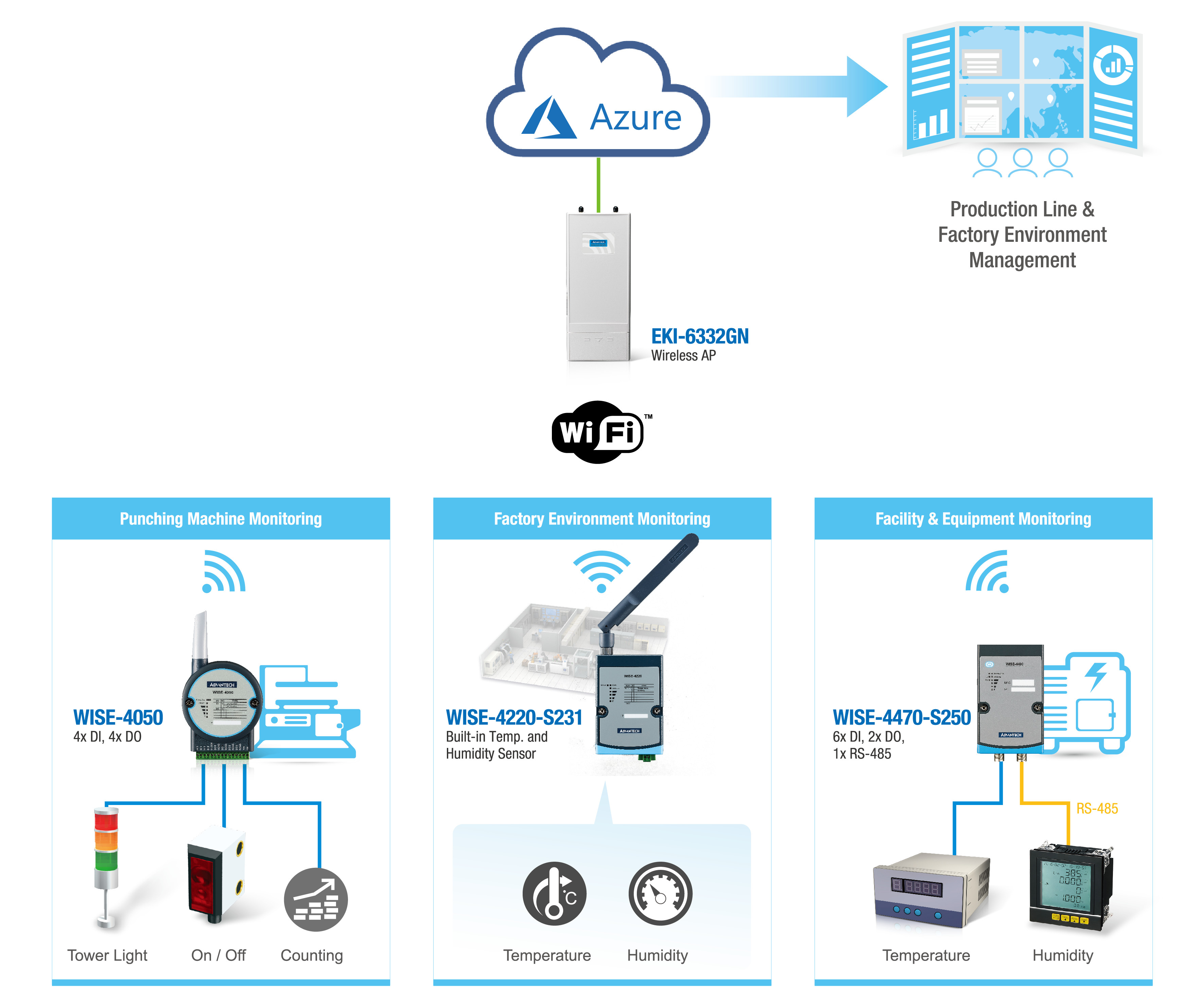 大多數(shù)現(xiàn)場(chǎng)設(shè)備是沒(méi)有PLC的沖壓機(jī)或沒(méi)有開(kāi)放通信端口的封閉系統(tǒng)。根據(jù)設(shè)備的不同情況,研華公司的WISE-4000系列和EKI-6332GN Wi-Fi接入點(diǎn)采用了多個(gè)IoT無(wú)線I / O模塊,以滿足金屬加工廠將生產(chǎn)設(shè)備聯(lián)網(wǎng)的需求并能夠監(jiān)控設(shè)備和整體設(shè)施。
