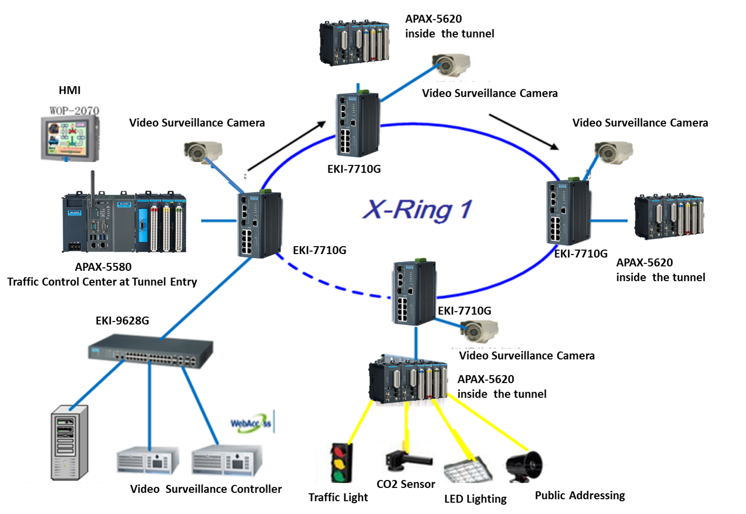 隧道監(jiān)控系統(tǒng)由幾個子系統(tǒng)組成,分別是照明,通風(fēng),交通指導(dǎo),閉路電視,火災(zāi)報警/控制,緊急通信和公共廣播(PA)系統(tǒng)。對于照明和通風(fēng)系統(tǒng),研華提供工業(yè)以太網(wǎng)交換機,可編程自動化控制器(PAC)和X環(huán)冗余網(wǎng)絡(luò)技術(shù),用于子系統(tǒng)之間的監(jiān)視,控制和可靠的數(shù)據(jù)傳輸。 在該系統(tǒng)中,使用EKI-7710G交換機從隧道中的各種設(shè)備和設(shè)備收集數(shù)據(jù),并形成網(wǎng)絡(luò)環(huán)以實現(xiàn)數(shù)據(jù)冗余。然后將所有數(shù)據(jù)傳輸?shù)娇刂剖抑械腅KI-9428G第3層交換機。研華的EKI-7700系列工業(yè)管理以太網(wǎng)交換機使用戶能夠以經(jīng)濟高效的方式快速擴展其工業(yè)網(wǎng)絡(luò)。其堅固的設(shè)計還確保了可靠性和穩(wěn)定性,而研華的X-Ring技術(shù)提供了最短的可用恢復(fù)時間(<10 ms),從而提高了網(wǎng)絡(luò)基礎(chǔ)設(shè)施的可靠性和速度。